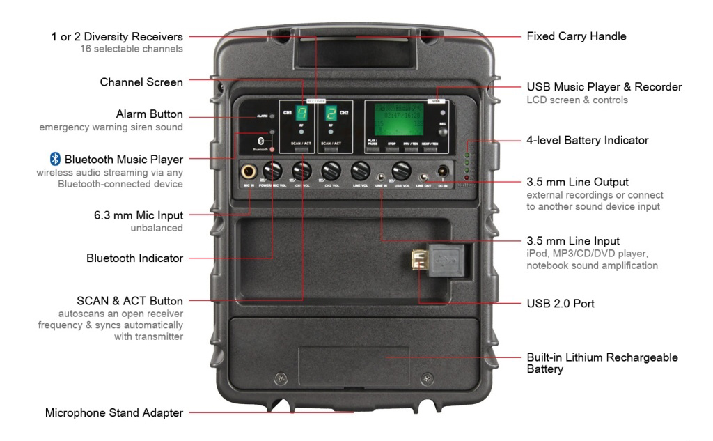MA-303 is a compact, ultra light and robust design wireless PA system. This features-loaded and easy-to-use system can be hand carried, or mounted on a microphone stand and is an excellent public address solution for small to medium crowds.