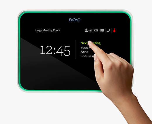 It’s only a fingertip away. The Evoko Room Manager is the beautiful touch-screen solution for all your meeting rooms. Make sure they’re being used in a truly effective way. Forget about double bookings, confusion and interrupted meetings. Book conference rooms easily and then have all information presented on the screen. Integrates seamlessly with the existing e-mailserver. Now you’ll get full insight into your organization’s meeting patterns to optimize resources. Get decision-making support that really cuts costs. If you have rooms for improvement – get in touch with the Evoko Room Manager.